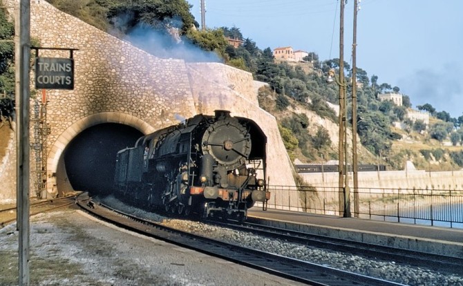 Eine unbekannte 141.R zieht 1964 einen Schnellzug die Mittelmeerküste entlang. Copyright: Konrad Pfeiffer / Slg. Eisenbahnstiftung